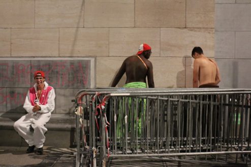 Dans la fosse, les esprits s’échauffent, le pogot s’invite, ça danse de toute part. La sécurité est sur les dents. Elle a peur des débordements. Un groupe de trois jeunes gars se promène torse nu. Ils se font alpaguer par les gars de la sécurité afin qu’ils se rhabillent décemment. Un torse nu, c’est mal.