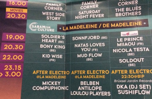 Vers 19h30, je rejoins des amis à la terrasse de chez Big Mama, à la place Saint-Jean, pour y dîner lorsque nous nous rendons compte que le concert ne démarre pas à 21h mais à 20h30 ! Le programme papier indique pourtant bien 21h mais ce n’était qu’une astuce du graphiste pour intégrer le logo de Télé-Bruxelles.