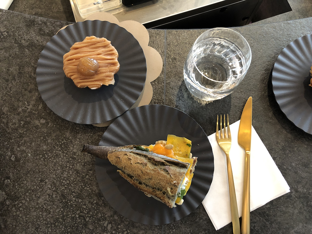 Nous nous mettons dans la file. Une dame souriante gère le flux des entrées et sorties. La boulangerie est composée d’un magasin au rez-de-chaussée et d’un salon de dégustation à l’étage. Le décor se veut sobre presque trop banal pour un endroit hype parisien.