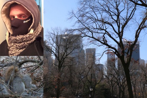 Bon, je sens que vous attendez une petite photo de Central Park qui se trouve juste à côté. Muni de ma jolie cagoule, j’ai été rien que pour vous prendre une photo des arbres et d’un écureuil (pas gelé). Pour plus, nous attendrons le réchauffement climatique.