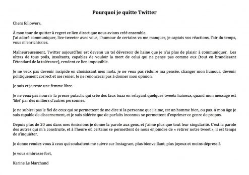 Karine Le Marchand quitte Twitter à regret mais le réseau social étant devenu un déversoir de haine que l’animatrice n’a plus de plaisir à y communiquer. Elle donne rendez-vous à ses fans sur Instagram.