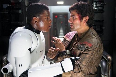 Le second personnage important est celui de Finn (John Bogeya). Ce stormtrooper au nom de FN-2187 se rebelle et libère Poe Dameron (Oscar Isaac), un brillant pilote de la résistance, des mains du nouveau grand méchant Kylo Ren. Il entre dans la résistance et fait équipe avec Rey pour retrouver Luke Skywalker. Lors de la première bataille on le voit essuyer sa main sur son casque et laisser des traces de sang. Une première dans l’histoire de Star Wars. On comprend que les stormtroopers ne sont plus des clones mais ils sont issus d’une sorte « d’élevage » de combattants.