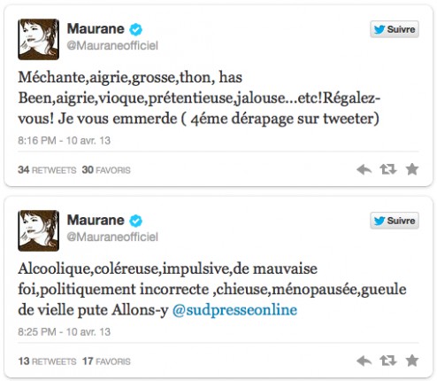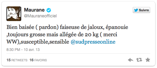 La chanteuse belge n’en était pas à son coup d’essai. En septembre 2011, elle avait répondu à une fan de Michaël Vendetta (la pseudo star qu’elle avait critiqué un peu tôt) « La grosse vache t’encule à sec avec du papier de verre, du tabasco et un zeste de citron ». Si la plupart des internautes l’avaient à l’époque soutenue, ce soutien s’est peu à peu tassé au fil de ses dérapages. En janvier dernier, elle s’en prenait à une internaute qui avait – encore gentiment – tweeté « Si toi aussi tu en as déjà marre d’entendre la pub de Weight Watcher & @Mauraneofficiel lève la main! lol ». Sans attendre, Maurane avait répondu « @blogtobealive Je comprends…En regardant votre photo de profil , je me dis que la jalousie , c ‘est vraiment con…. ». S’en suit alors un dialogue sur le réseau social durant lequel elle persiste : « @blogtobealive J’évite de respirer les poubelles. » Face au déchaînement médiatique né de ces tweets, l’interprète de Quand les sangs se verra obligée de présenter des excuses publiques et de proposer à la tweeteuse de la rencontrer.