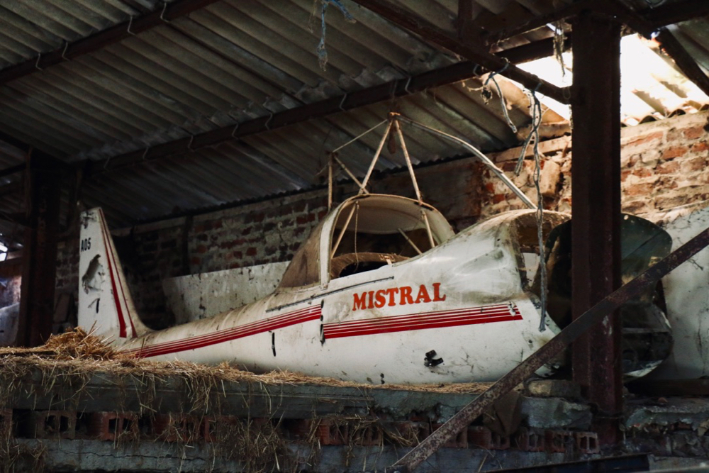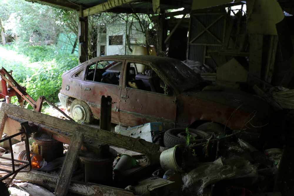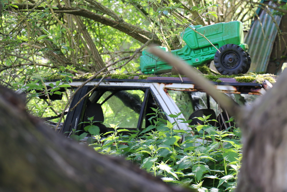 Au bout d’un petit petit chemin vert, une grille à moitié fermée vous donne un aperçu de la passion du propriétaire de cette maison abandonnée : amasser des objets en tous genres. Entre une calèche, des épaves de voitures, des tracteurs, un bébé en cage, vous y trouverez également le reste d’un petit avion et même un chat roux bien vivant.