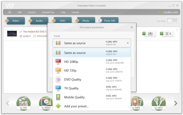 Si vous avez un film dont le format n’est pas supporté, vous pouvez convertir celui-là au moyen d’un convertisseur gratuit Freemake Video Converter pour avoir une extension nécessaire. Au fait, c’est aussi un bon outil pour la lecture des films hors ligne. Je parle d’un mode qui est assez ancien, i.e., ripper des DVD, MP4 en AVI pour le visionnage des films plus confortable à la télé ou sur un lecteur DVD. Si vous avez une riche collection de films DVD, vous pouvez profiter de cette option. De nos jours, il est difficile de trouver un ordinateur portable avec un lecteur DVD. Ainsi, lorsque votre collection est conservée sur un disque dur, ça facilite l’accès à celle-ci à tout moment. Pour sauvegarder votre collection DVD, exécutez Freemake Video Converter. Insérez votre DVD non-protégé et ajoutez son contenu au logiciel. Sélectionnez l’extension vidéo aussi bien que la qualité désirée et exécutez la conversion.