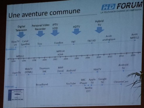 Pas d’anniversaire des hébergeurs vidéos au programme mais un retour sur les 20 ans du web où j’ai compris l’importance du sous titre de la manifestation (« international de la télévision sur Internet« ). Régis Saint Girons, Président de HD FORUM, nous a fait une ligne du temps exemplaire sur l’évolution des technologies qui ont amené les (r)évolutions que l’on connaît aujourd’hui tant en télévision que sur le net.